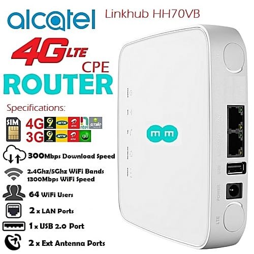 Alcatel 4GEE Linkhub HH70VB LTE CPE is a 300Mbps High Speed Internet Router for Homes and Offices. The device has Wi-Fi, 2 WAN/LAN ports and 1 USB port to enables you share the internet connection with multiple users and share your printer and USB hard disks within the office or Home. It supports 3/4G Networks on Smile, Airtel, 9Mobile, MTN, NTEL and 3G Network only on Glo.