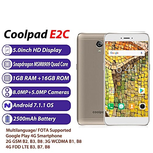 The Coolpad E2C features a big 5.0inch HD display with 1208*720P resolution for presenting clear video and the vivid pictures taken by the professional photographer- 8.0MP + 5.0MP cameras. The phone is powered by Snapdragon MSM8909 Quad Core processor and running Android 7.1 OS, coupled with 1GB RAM 16GB ROM of storage, for delivering premium performance.