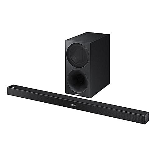Enjoy wireless audio streaming with the Samsung 320W 2.1-Channel Soundbar System. This system delivers up to 320W of total power and includes an external wireless subwoofer. An HDMI input provides a digital connection for high-resolution video and audio. Additional inputs include optical, 1/8″ aux, and a micro-USB; USB devices such as thumb drives can be connected via an optional adapter. The HDMI output is ARC-compatible to reproduce display-based audio, such as from apps built into your display. Bluetooth connectivity is built into the soundbar for wireless audio streaming from devices like MP3 players, smartphones, and tablets. Additionally, this soundbar is compatible with Dolby Digital and DTS 2-channel audio.