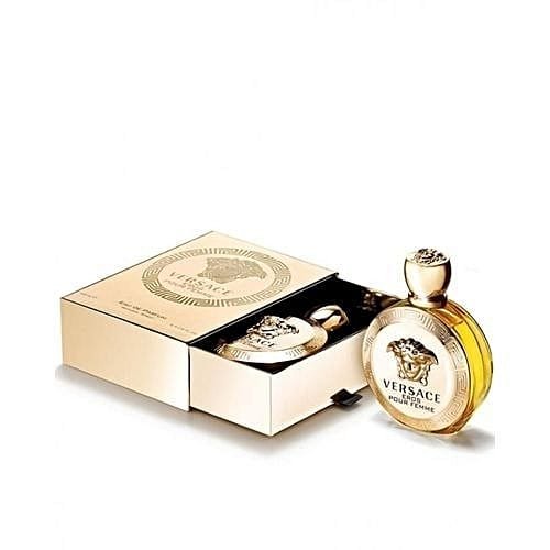 Named after the Greek god of love, Eros Pour Femme is described as a “perfume for passionate women, the ultimate in power and seduction from Versace”. The juice – opens on notes of lemon, bergamot and pomegranate, building to a floral heart of jasmine, peony and lemon flower. Ambrox, musk and sandalwood feature in the dry-down. The fragrance is presented in a round, gold-coloured flacon adorned with the signature Versace Medusa motif on the front and the top of the cap. Instead of a standard outer carton, the EDP (available as 100ml) nestles within a deluxe, drawer-like coffer.